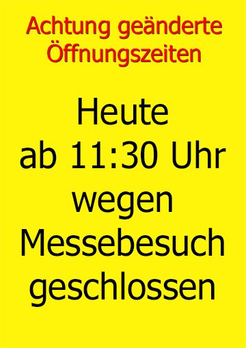 Heute am Donnerstag 19. März ist unser Geschäft wegen Messebesuch ab 11:30 Uhr geschlossen.