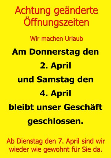 Am Donnerstag den 2. April und Samstag den 4. April ist unser Geschäft geschlossen